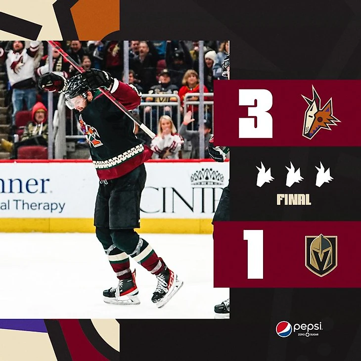 "Аризона Койтс"-"Вегас Голден Найтс" 3:1.Николай Шмальтц забросил 2 шайбы,Джейкоб Чичрун отдал 2 результативные передачи,Скотт Уэджвуд отразил 33 броска.