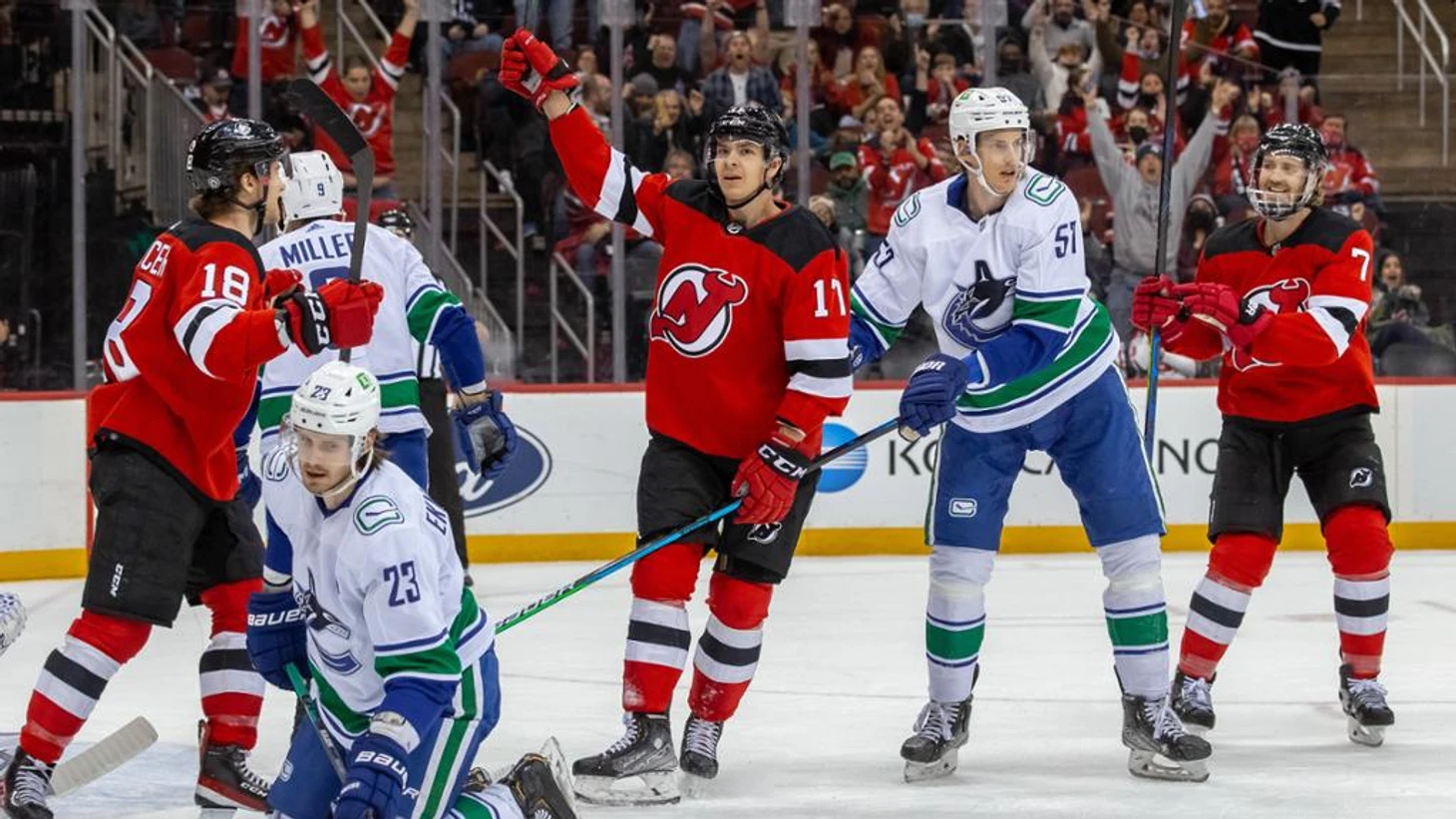 "Нью-Джерси Дэвилз"-"Ванкувер Кэнакс" 7:2.Егор Шарангович,Доусон Мерсер,Йеспер Братт,Йеспер Буквист,Джэк Хьюз и Райан Грейвз набрали по 2 очка (1+1),Нико Хишир отдал 2 результативные передачи,Николас Доус отразил 36 бросков.У гостей Василий Подколзин забросил одну шайбу.