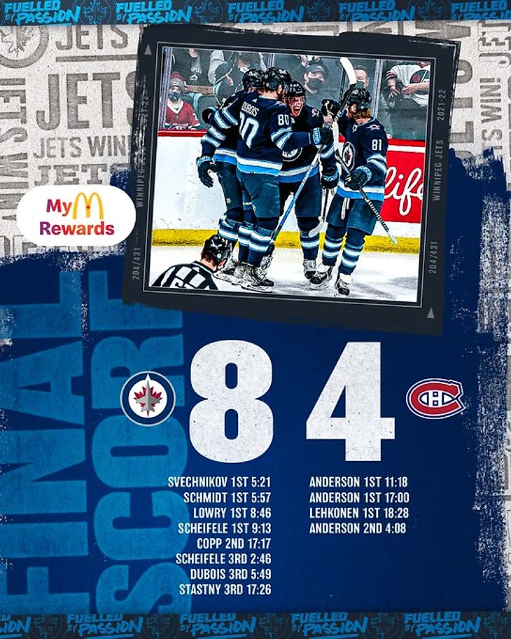 "Виннипег Джетс"-"Монреаль Канадиенс" 8:4.В первом периоде команды забросили 7 шайб.Марк Шайфли набрал 3 очка (2+1),Пьер-Люк Дюбуа наьрал также 3 очка (1+2),Кайл Коннор отдал 3 результативные передачи,Эндрю Копп,Адам Лоури,Евгений Свечников,Пол Штясны и Нэйт Шмидт набрали по 2 очка (1+1),Блэйк Уилер отдал 2 результативные передачи,Коннор Хеллебайк отразил 31 бросок.У гостей Джош Андерсон забросил 3 шайбы.В третьем периоде Марк Шайфли подрался с Крисом Уайдмэном.