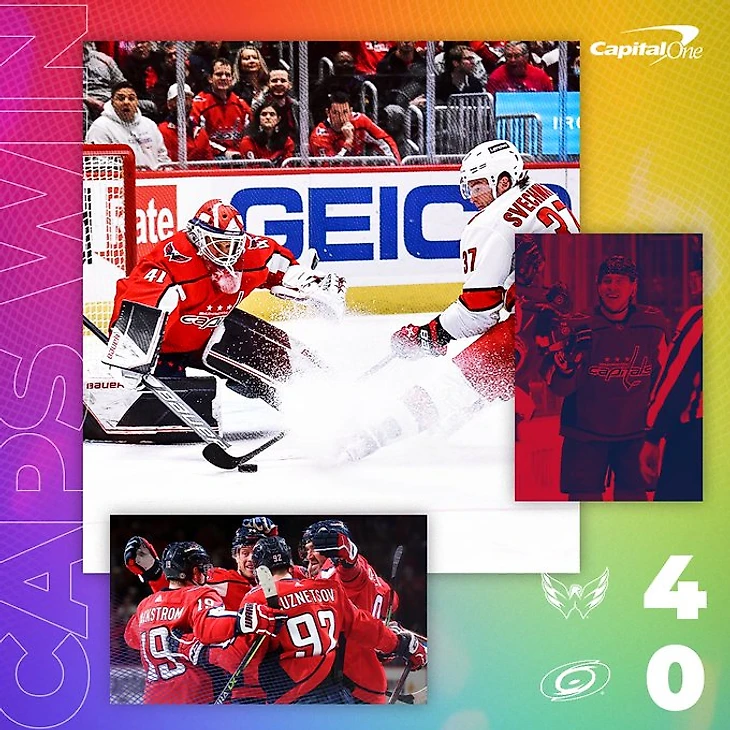 "Вашингон Кэпиталз"-"Каролина Харрикейнз" 4:0.Конор Шири отдал 2 результативные передачи,Александр Овечкин с Дмитрием Орловым и Евгением Кузнецовым забросили по шайбе,Витек Ванечек отразил 36 бросков и сыграл 3 сухую игру в сезоне."Кэпс" прервали серию из 3 поражений подряд.