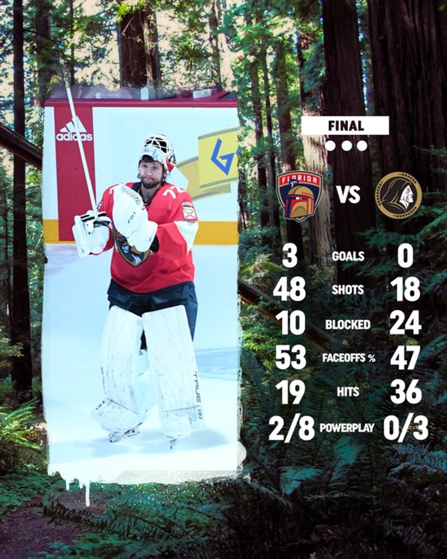 "Флорида Пантерз"-"Оттава Сенаторз" 3:0.Мэйсон Марчмент и Патрик Хорнквист набрали по 2 очка (1+1),Сергей Бобровский отразил 18 бросков и сыграл второй сухой матч в сезоне."Пантеры" прервали серию из 3 поражений подряд.