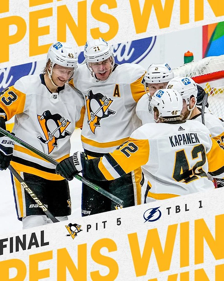 "Тампа-Бэй Лайтнинг"-"Питтсбург Пингвинз" 1:5.Евгений Малкин набрал 3 очка (1+2),Дантон Хайнен с Джейком Гюнтцелем и Сидни Кросби набрали по 2 очка (1+1),Тристан Джарри отразил 20 бросков.В первом периоде Брейден Пойнт подрался с Крисом Летангом,во втором периоде состоялась массовая драка."Пингвины" выиграли 3 игру подряд.