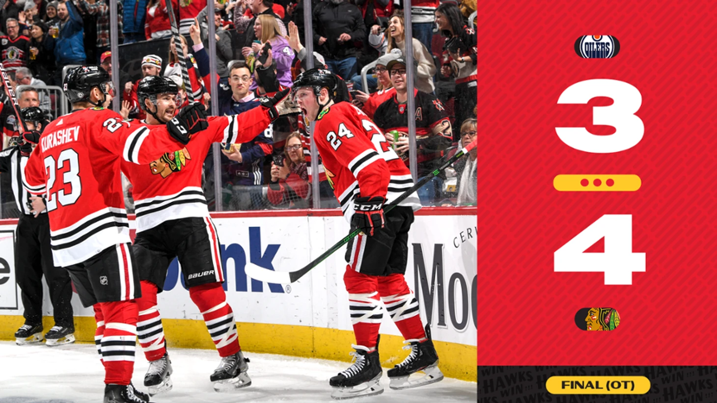 "Чикаго Блэк Хоукс"-"Эдмонтон Ойлерс" 4:3 (ОТ).Алекс ДеБринкат в овертайме принёс победу хозяевам.Патрик Кейн набрал 2 очка (1+1),Марк-Андре Флери отразил 29 бросков.У гостей Эвандер Кейн забросил 2 шайбы,Леон Драйзайтль набрал 2 очка (1+1),Коннор МакДэвид отдал 2 результативные передачи.