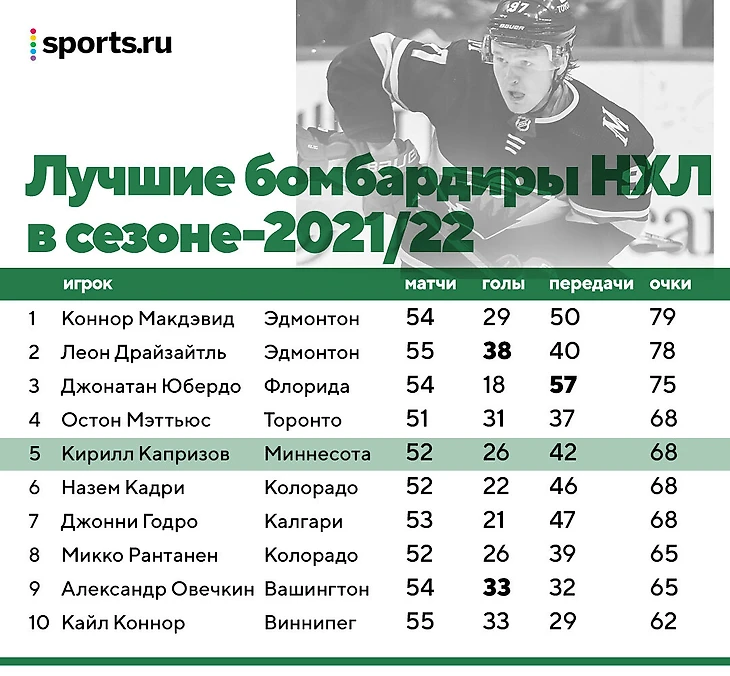 В общей гонке бомбардиров впереди Капризова – единицы. Весьма звездные единицы. Отрыв, конечно, приличный, но это не значит, что Кирилл не сможет из догнать – особенно, если «Эдмонтон» начнет опять буксовать.