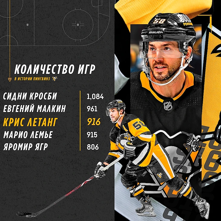 Он обогнал СуперМарио! После матча "Питтсбсург Пингвинз" - "Каролина Харрикейнз" (2:3ОТ) Крис Летанг обогнал Марио Лемье по количеству проведённых игр за "Пингвинз". на первом месте расположился Сидни Кросби (1084), далее идут - Малкин (961), Летанг (916), Лемье (915), и на закрепляет топ Яромир Ягр с 806-ю играми. В 916 играх Крис Летанг набрал 631 очко, забив 140 голов, и отдав 491 голевую передачу.