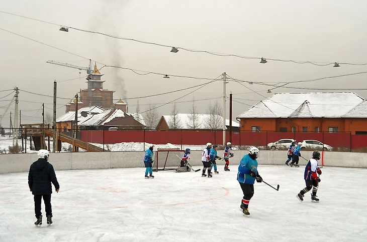 Открытый каток находится на окраине Кызыла, в частном секторе. За ним – высоченный дацан – буддистский храм, который предыдущий губернатор амбициозно хотел сделать самым высоким в мире, но пока это вылилось только в то, что дацан уже несколько лет стоит недостроенным.