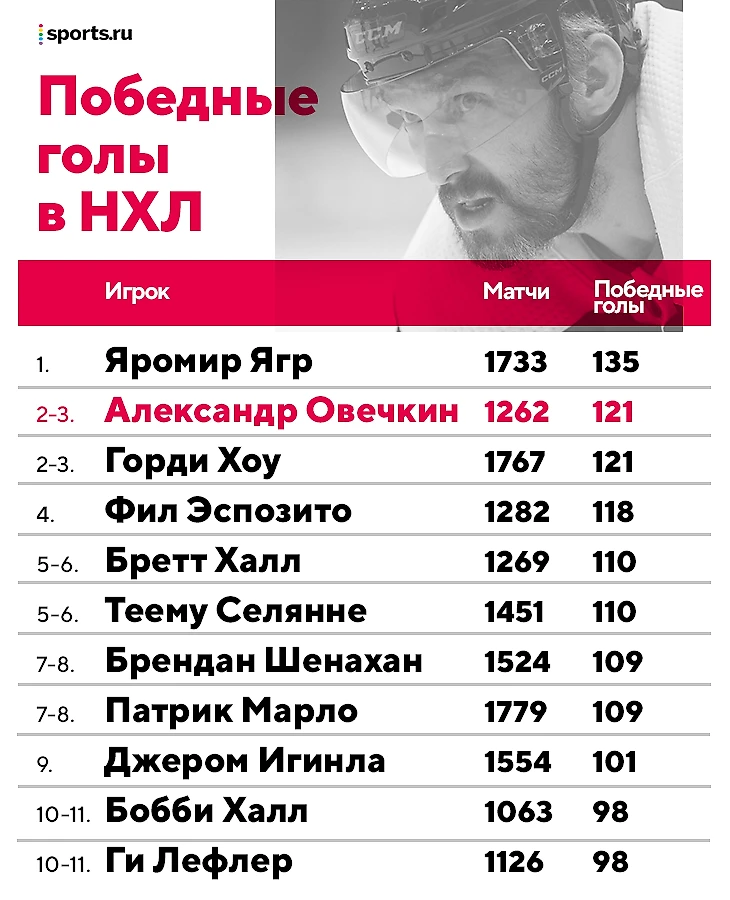 У Овечкина теперь 121 победный гол – а это значит, что по этому показателю он догнал Горди Хоу, которого он преследует в исторической таблице снайперов. Интересно, что для выхода на первое место здесь придется снова обходить Ягра – ну Овечкину не привыкать.