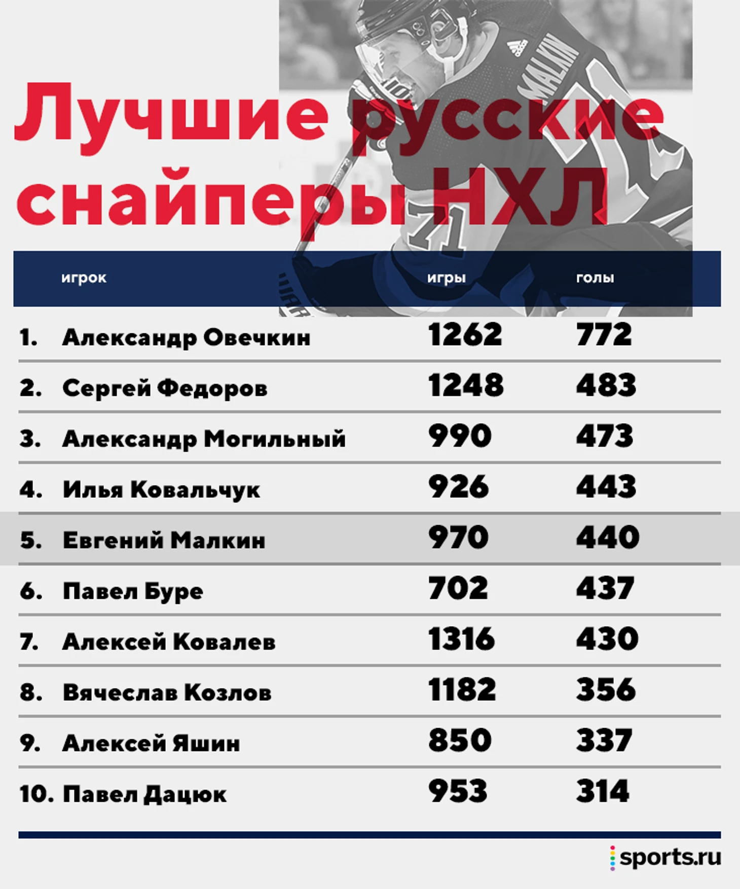 Благодаря этому хет-трику Евгений Малкин обошел Павла Буре в списке самых результативных русских снайперов НХЛ – теперь он единолично пятый.
