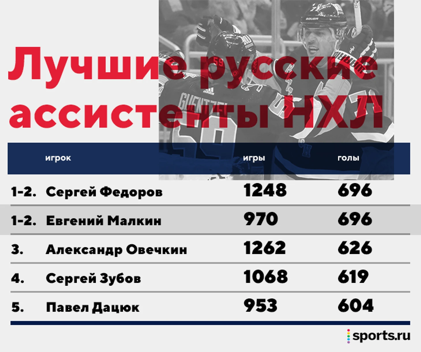 Это 696-я голевая передача Малкина в НХЛ – столько же было у Сергея Федорова. Больше – ни у кого из наших в НХЛ за всю историю. Уже в следующем матче Евгений может забрать себе титул лучшего распасовщика из России.