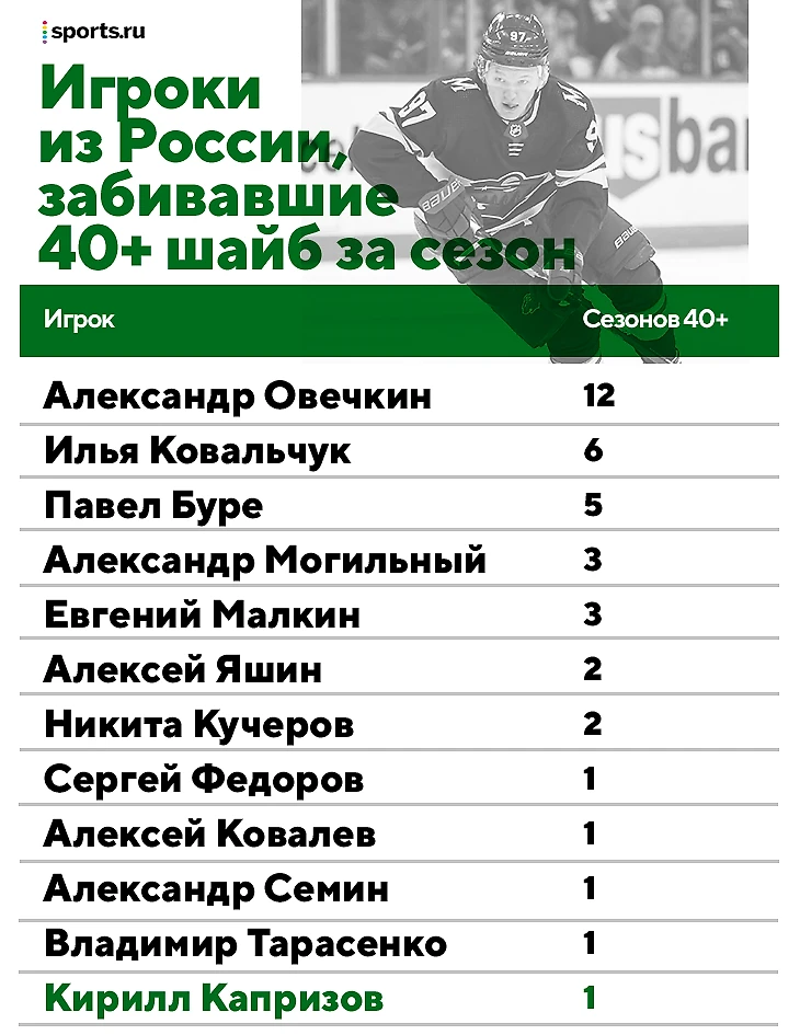 Примерно на таком же расслабоне он вколотил предыдущие 39 шайб – его стабильность и уверенность в себе поражают, особенно после тяжелого старта регулярки. А еще Капризов вошел в элитный клуб – стал 12-м игроком из России, который забивал 40 шайб в регулярках НХЛ.