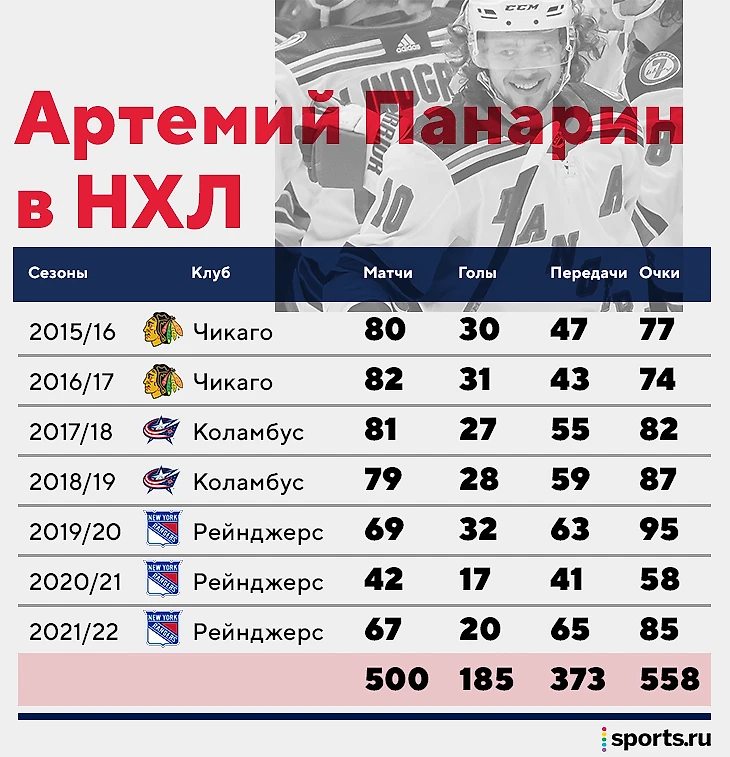 Из действующих игроков только трое набрали больше очков за то время, что Панарин выступает в НХЛ: Леон Драйзатль (598 очков), Патрик Кэйн (611) и Коннор Макдэвид (680). А Брэд Маршанд – столько же, 558 очков.