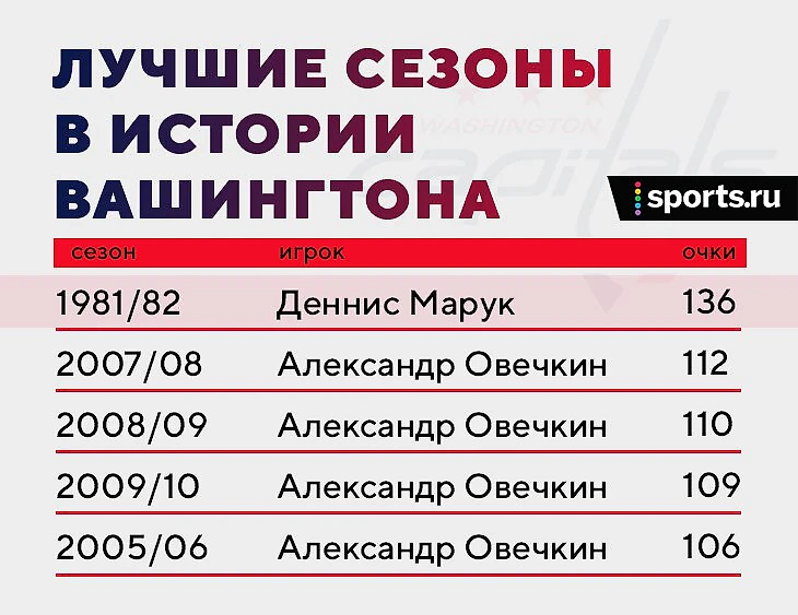 Это клубный рекорд по очкам за один сезон. Чтобы вы понимали, насколько это удивительная история, посмотрите на топ-5 лучших бомбардирских сезонов в истории «Кэпиталс».
