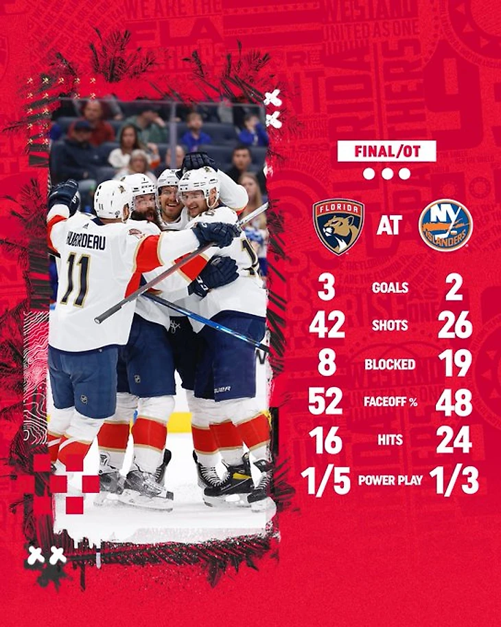 "Нью-Йорк Айлендерс"-"Флорида Пантерз" 2:3 (ОТ).Александр Барков в овертайме принёс победу хозяевам.Александр Барков забросил 3 шайбы,Джонатан Юбердо отдал 3 результативные передачи,Сергей Бобровский отразил 24 броска."Пантеры" выиграли 11 игру подряд.
