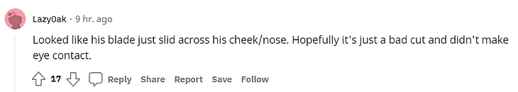 «Выглядит так, будто его клюк проехался по его щеке или носу. Надеюсь, там лишь рассечение и глаз не задет»