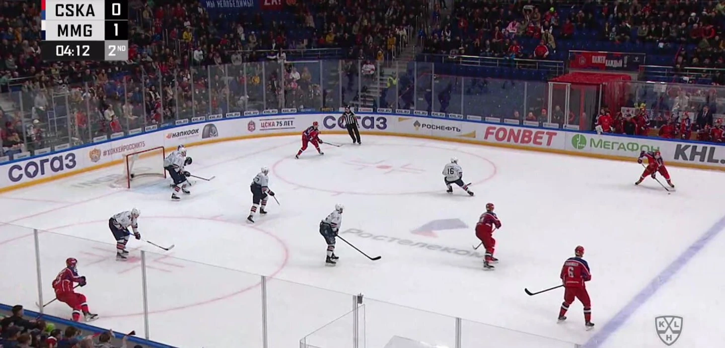 За 6:50 до второго перерыва ЦСКА начал свою позиционку – на площадке у «Магнитки» оказались Денис Зернов, Максим Карпов, Николай Голдобин, и пара защитников Дронов – Минулин.