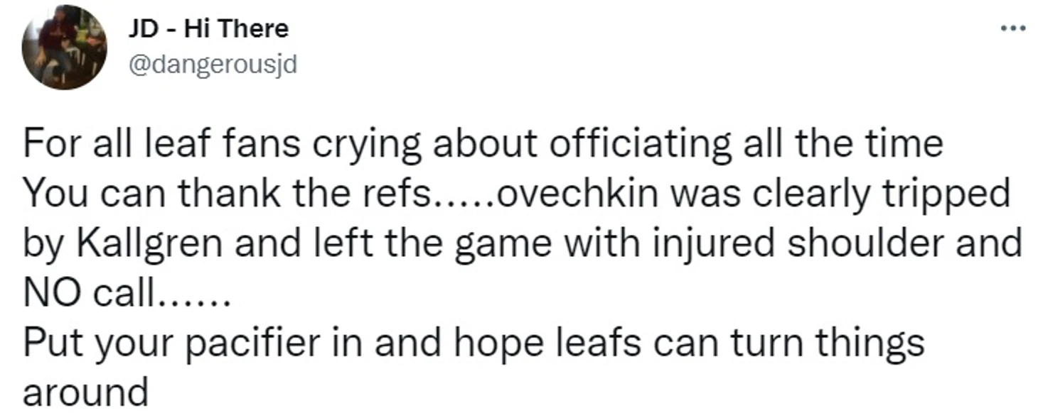 «Всем фанам «Лифс», которые ноют о судействе. Вы должны благодарить судью. Кельгрен явно уронил Овечкина, тот покинул игру с травмированным плечом, а вратарь не получил удаления»