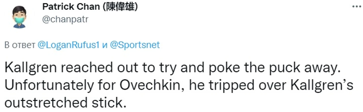 «Кельгрен потянулся, чтобы отбить шайбу. К несчастью для Овечкина, он споткнулся о вытянутую клюшку Каллгрена»