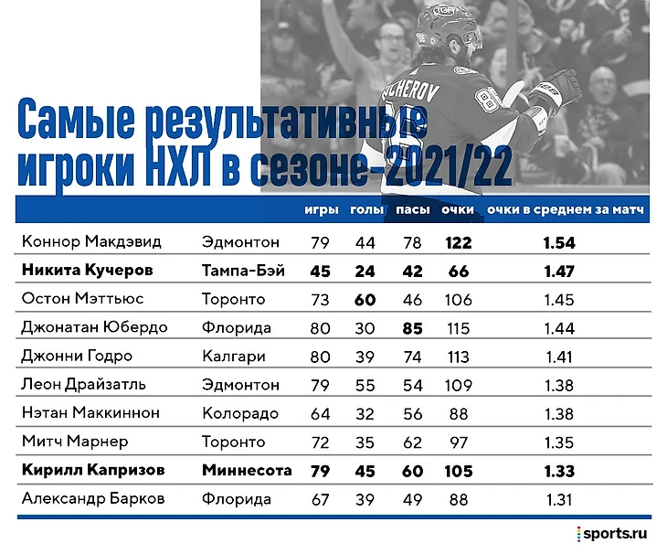 Вообще травмы Никиты выбили его из гонки за «Арт Росс Трофи» – он вполне мог составить конкуренцию Макдэвиду, и, может быть, побить личный рекорд в 128 очков.Поразительно, что, даже пропустив 35 матчей в сезоне, Кучеров все равно близок к топ-50 бомбардиров НХЛ. У него потрясающая результативность.