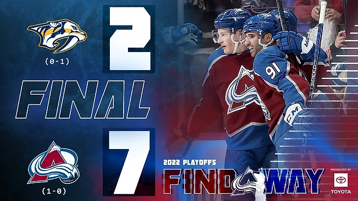 "Колорадо Эвеланш"-"Нэшвилл Предаторз" 7:2.Хозяева в первом периоде забросили 5 шайб.Натан МакКиннон набрал 3 очка (2+1),Микко Рантанен отдал 3 результативные передачи,Кейл Макар набрал также 3 очка (1+2),Габриэль Ландеског набрал 2 очка (1+1),Валерий Ничушкин отдал результативную передачу,Дарси Кемпер отразил 23 броска.У гостей Мэтт Дюшен забросил 2 шайбы,Микаэль Гранлунд отдал 2 результативные передачи."Лавины" повели в серии 1-0.