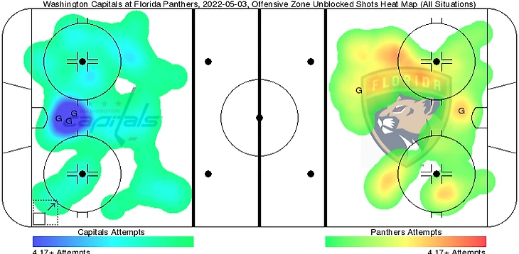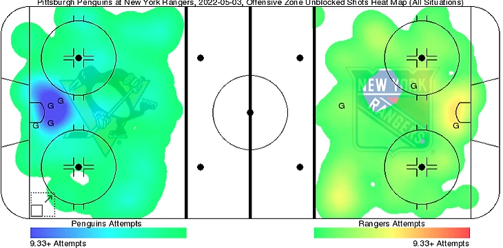 «Питтсбург» и «Вашингтон» чуть-чуть лучше управляли игрой, и это блистательно видно по тепловым картам бросков, которые получились практически идентичными.