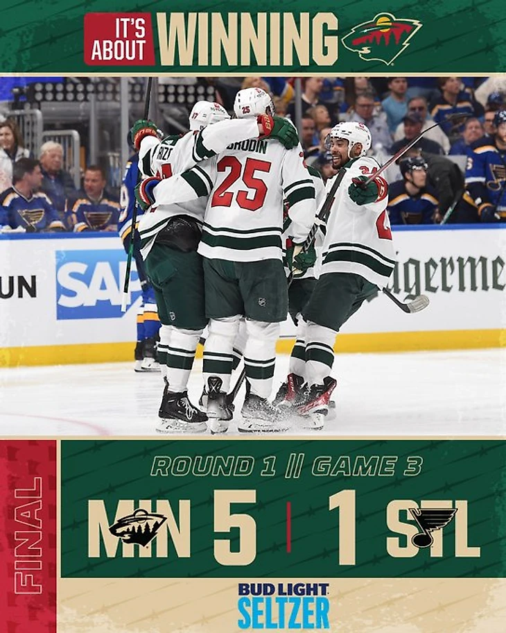 "Сент-Луис Блюз"-"Миннесота Уайлд" 1:5.Кирилл Капризов и Йоэль Эрикссон набрали по 2 очка (1+1),Маркус Фолиньо и Райан Хартман отдали по 2 результативные передачи,Марк-Андре Флери отразил 29 бросков."Дикари" повели в серии 2-1.