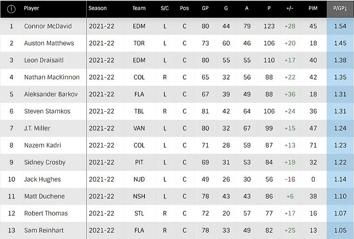 Пропускали в среднем 3,68 гола за матч – худший результат «Нью-Джерси» в этом веке. Но интересно вот что: из 20 худших команд на указанном отрезке 7 играли в сезоне-2021/22 – кроме «Нью-Джерси» это «Монреаль», «Детройт», «Аризона», «Филадельфия», «Коламбус» и «Чикаго». Вот и причина всплеска результативности, когда сразу восемь игроков набрали больше 100 очков в регулярке – почти у четверти команд лиги вратари вообще не ловили.