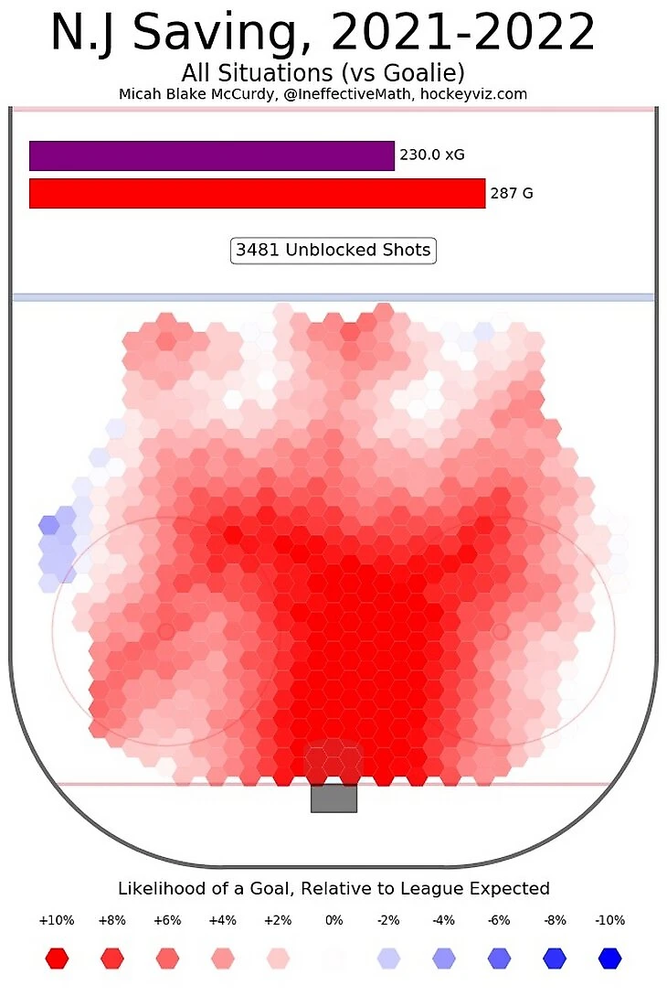 Зафиксируем: в сезоне-2021/22 в равных составах «Дьяволы» перебрасывали соперника. И даже круче: с точки зрения ожидаемых голов создавали более качественные броски, чем их оппоненты. В последний раз такое наблюдалось в сезоне-2013/14, на осколках команды-финалиста. Тогда еще собралась чешская банда Ягр – Элиаш – Жидлицки, а средний возраст состава давал прикурить нынешним «Айлендерс». Восемь лет назад!