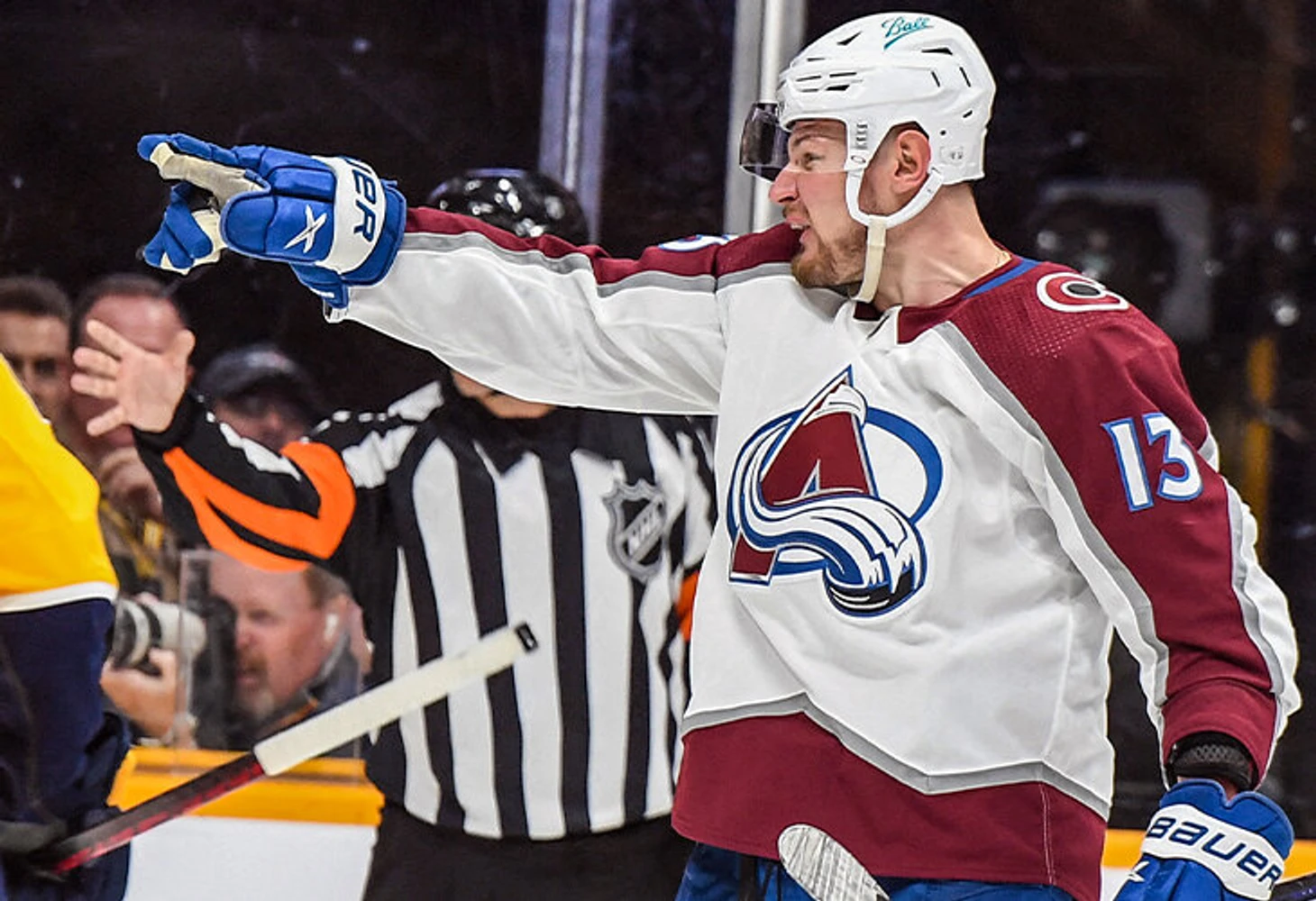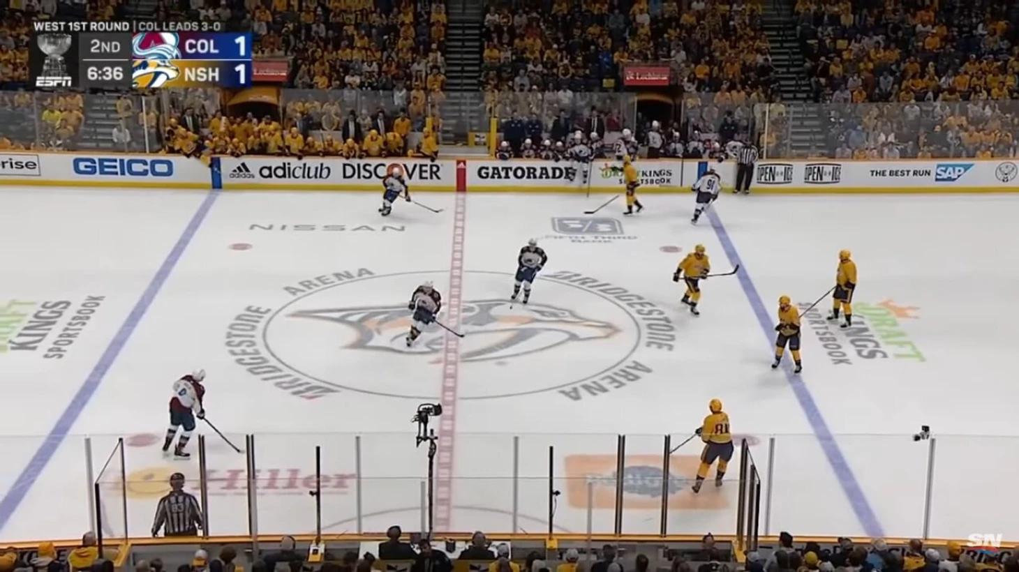 Не вышло ни разу – через несколько секунд Кэйл Макар, что на скрине с шайбой, мощно попадет от синей линии. «Колорадо» воспользуется сменой одного игрока (!) у «Нэшвилла».