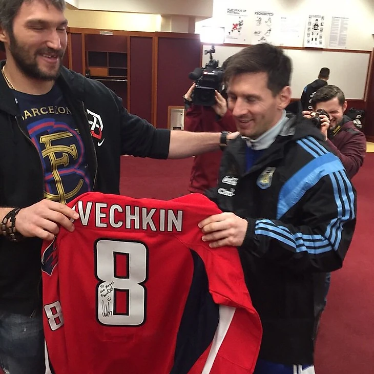 Овечкин подарил Месси свитер «Вашингтона» с 8-м номером и своим автографом, а потом выложил фотку в Лео в твиттер и подписал: «Вау!!!Лучший!!!!!! Лео Месси!!!!!»
