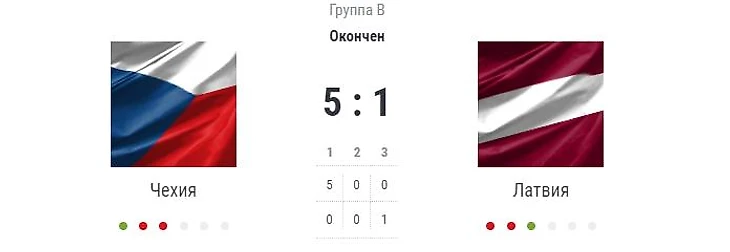 Абсолютно катастрофическим для сборной Латвии выдался первый период, в котором подопечные Харийса Витолиньша пропустили пять шайб. Уже на 5-й минуте Гинек Зогорна оказался первым на пятачке, обвёл Элвиса Мерзликина и легко отправил шайбу в сетку ворот.