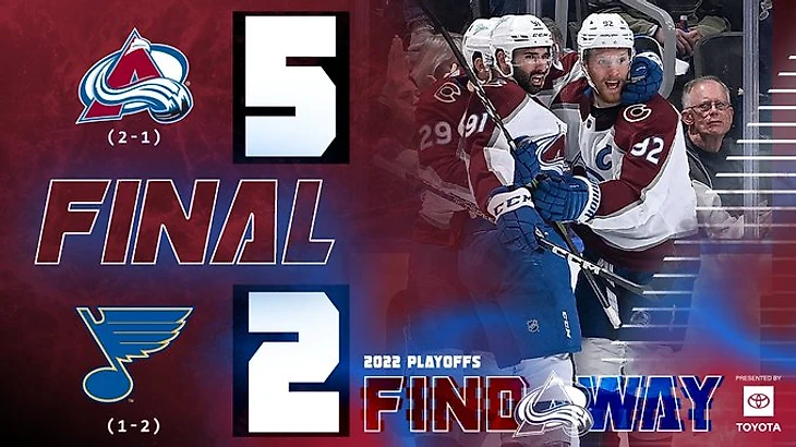 "Сент-Луис Блюз"-"Колорадо Эвеланш" 2:5.Арттури Лехконен забросил 2 шайбы,Назем Кадри набрал 2 очка (1+1),Микко Рантанен отдал 2 результативные передачи,Валерий Ничушкин отдал результативную передачу,Дарси Кемпер отразил 29 бросков.У хозяев Райан О'Райлли набрал 2 очка (1+1),Павел Бучневич отдал результативную передачу."Лавины" вышли вперёд 2-1.