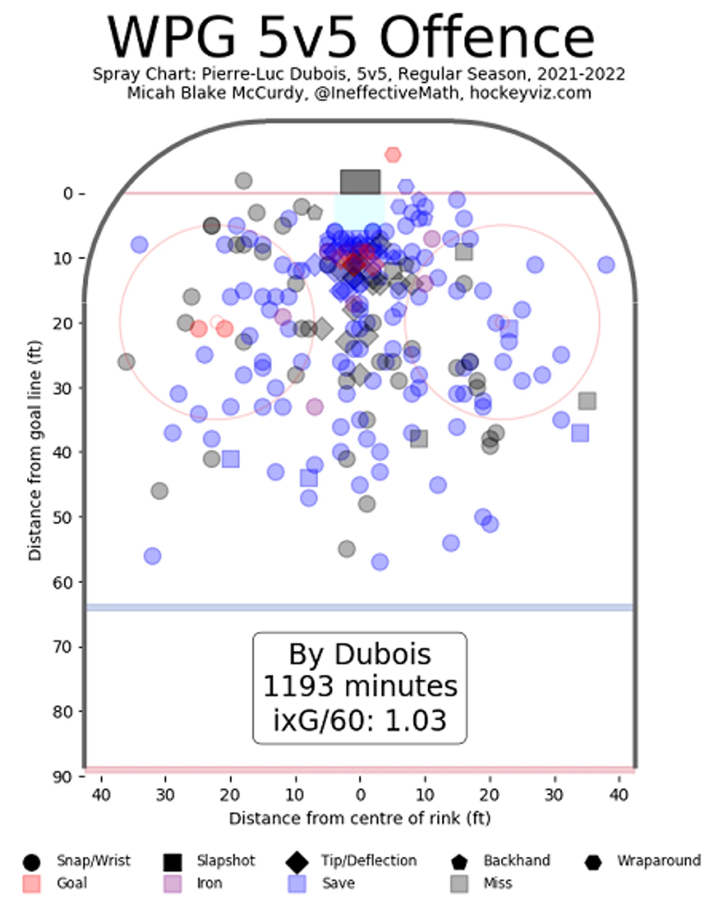Такая опасность Дюбуа объясняется тем, что он, пожалуй, единственный игрок «Джетс», который не только не боится играть на чужом пятаке, но и действует там очень эффективно. Достаточно посмотреть на карту бросков в равных составах, чтобы понять, где у Дюбуа находится офис.