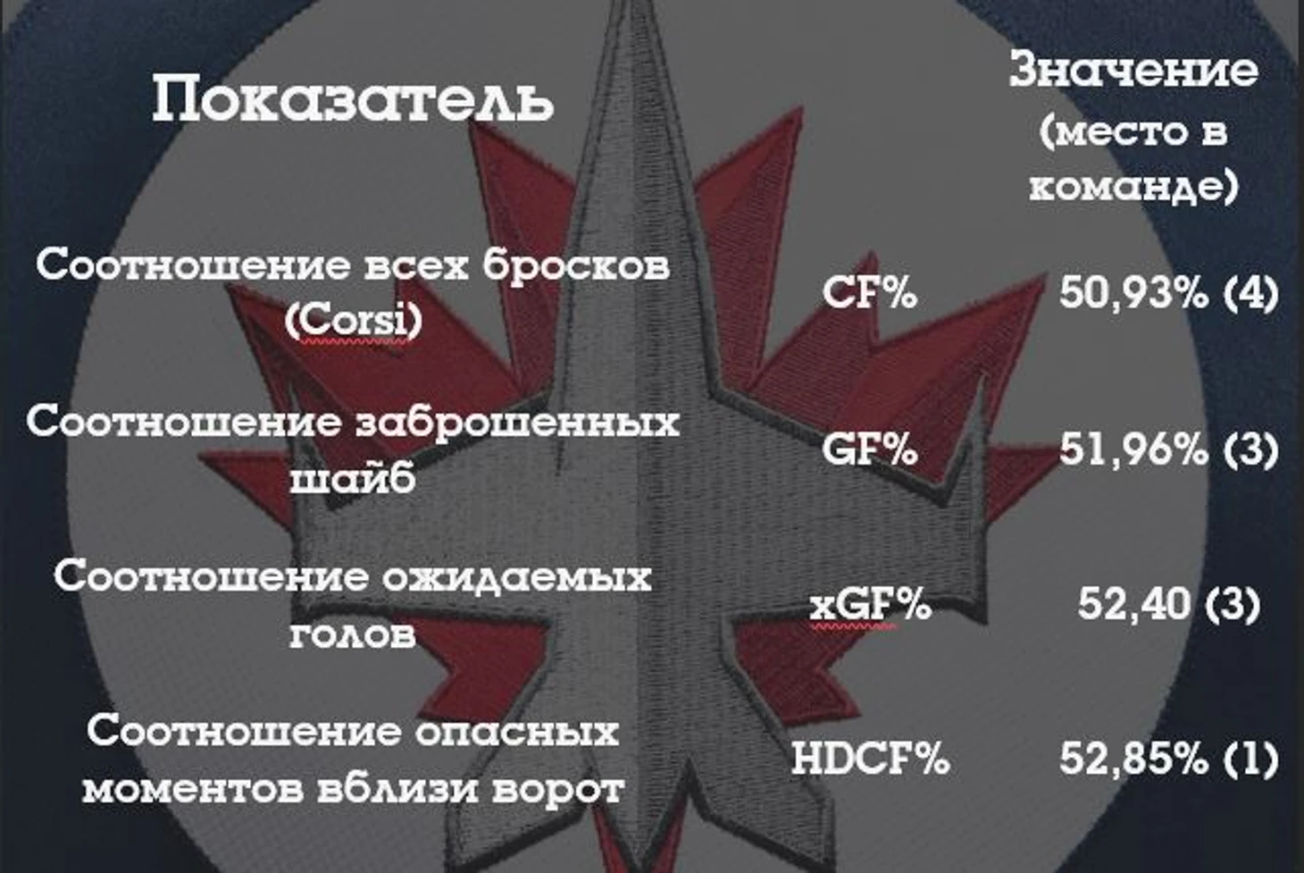 Но в отличие от Кайла Коннора и Марка Шайфли ценность Дюбуа определялась не только результативностью, но и качественной игрой на обеих сторонах площадки. Интересно посмотреть, как выглядит «Виннипег» в плане продвинутой статистики в равных составах, когда 80-й номер находится на площадке.
