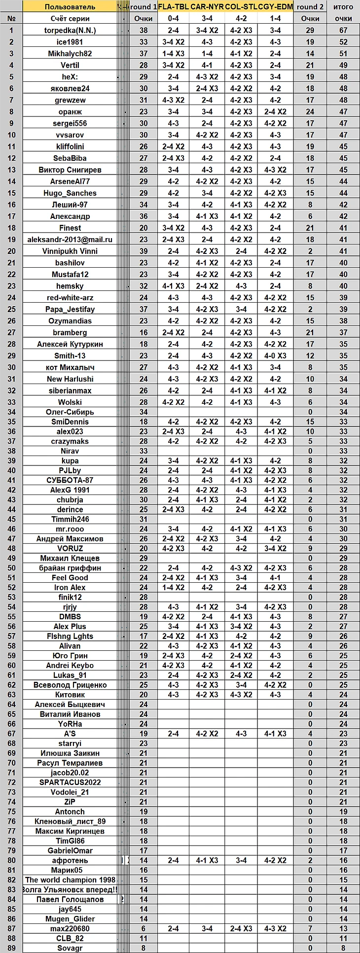 Результаты по итогам двух раундов: