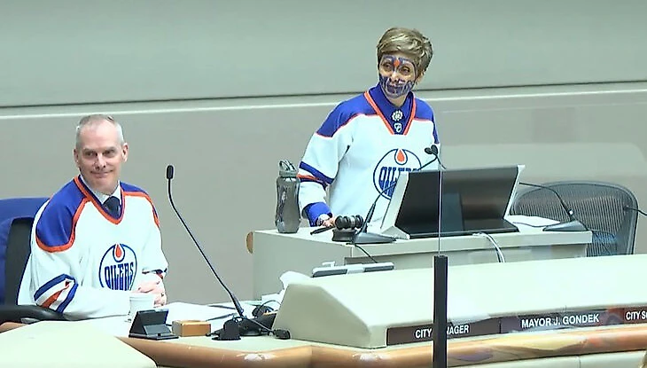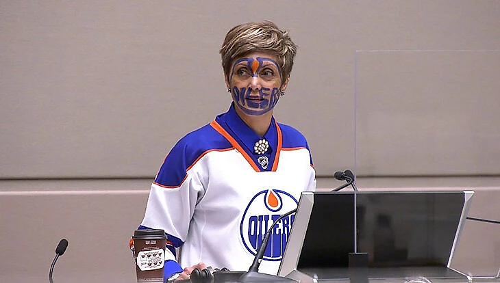 Мэр Калгари в цветах «Эдмонтона» (и даже с расписанным лицом) пришла на городское заседание. Потому что проспорила!