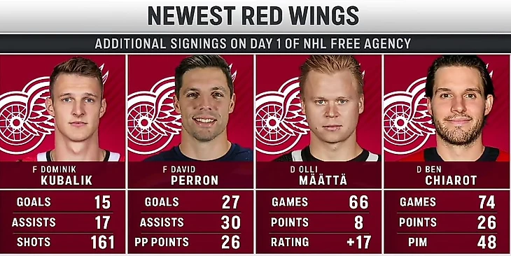 В первые же часы после открытия Стив Айзерман принялся объявлять одну сделку за другой. Сначала "Детройт" объявил о подписании Эндрю Коппа из "Рейнджерс", контракт был подписан на 5 лет и 28,1 миллиона долларов. Сразу после Коппа "Детройт" подписал силового защитника Бена Чиарота, проведшего предыдущий сезон во "Флориде". Контракт заключен на 4 года и 19 млн долларов, что можно считать большой победой для "Крыльев", учитывая, что Бен может играть в первой паре защитников как при игре в равных составах, так и в меньшинстве. Также был подписан защитник во вторую пару Олли Мяяття на год и 2,25 млн долларов. Айзерман тоже усилил топ-6 левым нападающим Домиником Кубаликом на 2 года и 5 млн долларов и правым нападающим Давидом Перроном, подписанным на 2 года и 9,5 миллионов долларов. Были подписаны нападающие Мэтт Лафф и Остин Чарник, а также защитник Марк Пысик на один год, зарплата – 850 тысяч долларов. До открытия рынка из "Сент-Луиса" был выменен вратарь Вилле Хуссо, с которым подписали контракт на три года и 14,25 млн долларов.
