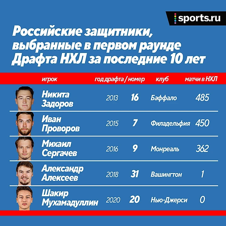 Идем дальше. Из пяти россиян только один сделал себе имя в КХЛ – это Шакир Мухамадуллин. Остальные – Никита Задоров, Иван Проворов, Михаил Сергачев, Александр Алексеев – скорее, продукты североамериканской системы. Эти парни развивались в канадских юниорских лигах и на высокий выбор наиграли именно там.