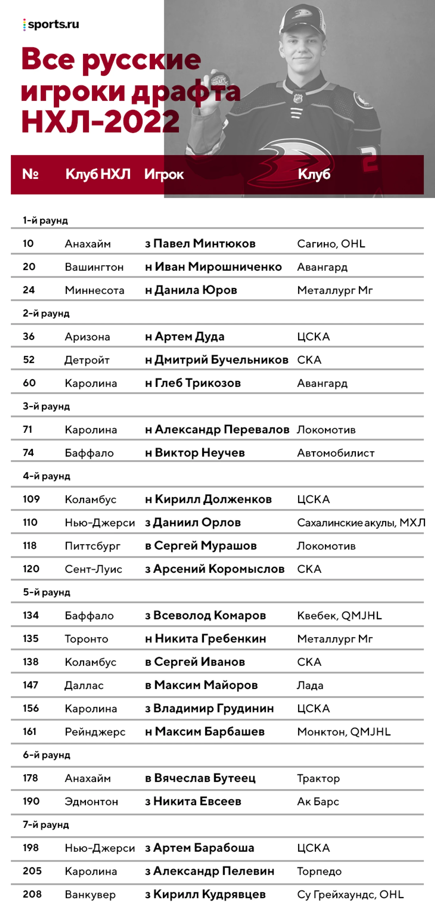 Интересно, что 19 из 23 наших хоккеистов с этого драфта в прошлом сезоне выступали в России – Данила Юров пусть мало, но играл в КХЛ, Иван Мирошниченко и Никита Евсеев большую часть времени провели в ВХЛ, остальные были в числе лидеров своих команд в МХЛ.