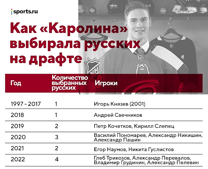 И тут интересно вот что: за первые двадцать лет после переезда из Хартфорда, с 1997 по 2017 годы, «Каролина» взяла на драфте только одного русского игрока – Игоря Князева, который так до НХЛ и не доехал. В 2018-м под вторым номером «ураганы» выбрали Андрея Свечникова, и началось! За последние четыре года «Каролина выбрала аж 11 российских игроков!