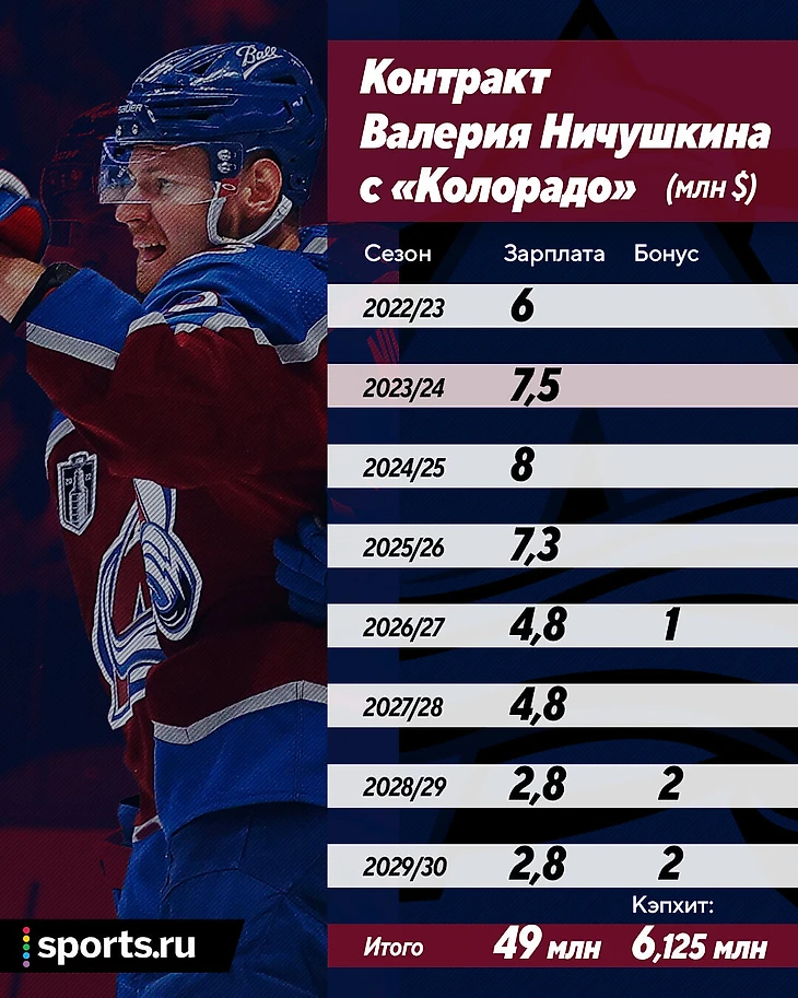 Теперь немного о деталях контракта Ничушкина. Восемь лет, 49 млн долларов, кэпхит – 6,125 млн. В первые три года будет действовать полный запрет на обмен, в дальнейшем при возможном обмене он может предоставить список из 12 команд, в которых он не хотел бы продолжить карьеру. Восьмилетнее соглашение – это максимальный срок по коллективному соглашению. Разбивка зарплаты по сезонам следующая: