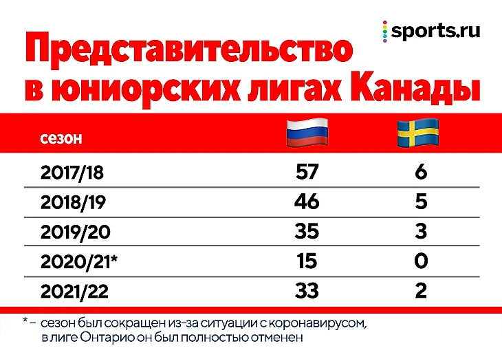 Приведем говорящую цифру – в трех канадских юниорских лигах (QMJHL, OHL и WHL) в прошлом сезоне играли всего пять хоккеистов из Швеции. А наших там – десятки каждый год. Исключением стал только ковидный чемпионат-2020/21, когда лига Онтарио, например, вообще не играла.