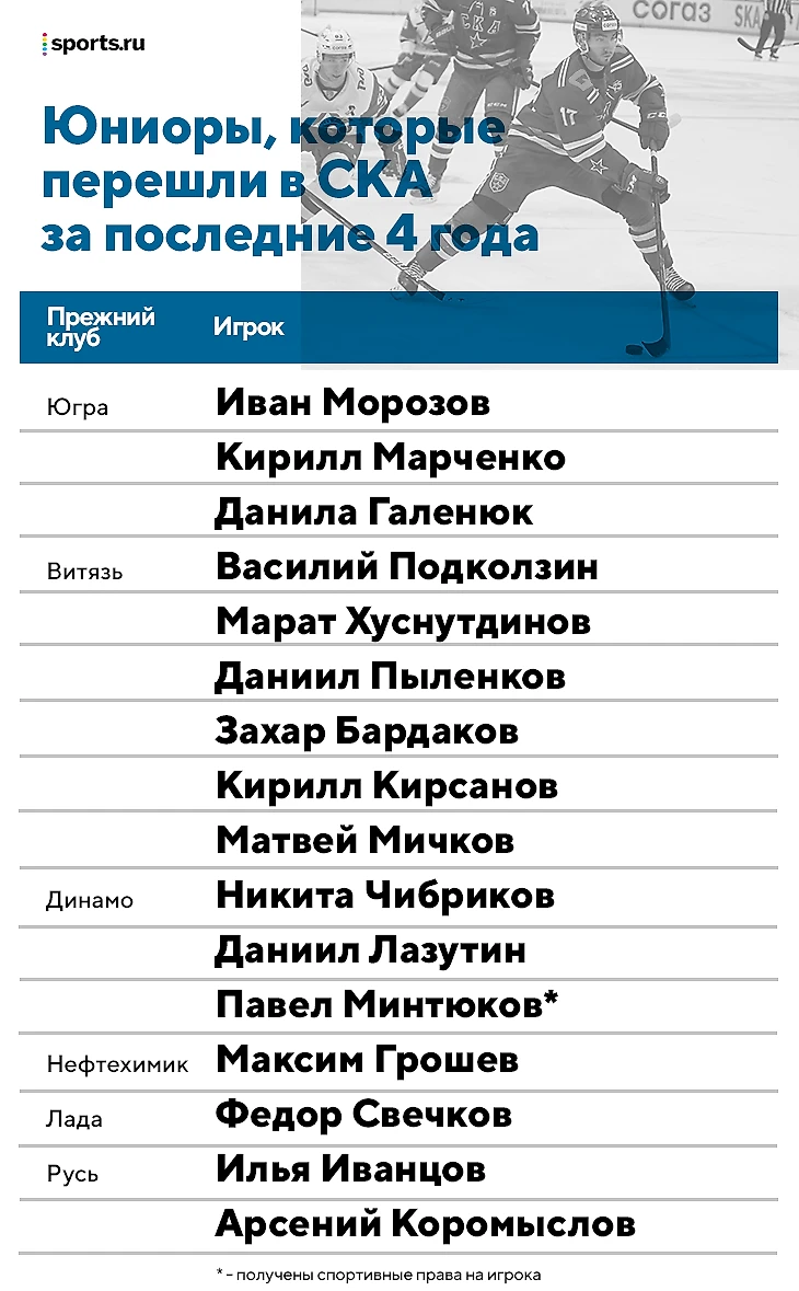 В целом же по этому обмену видны два принципиально разных подхода. В период, когда глава СКА руководил сборными (и когда они играли на чемпионатах мира), в Питере собирали топовую молодежь со всей страны. Просто посмотрим, кого армейцы забрали в последние 3-4 года:
