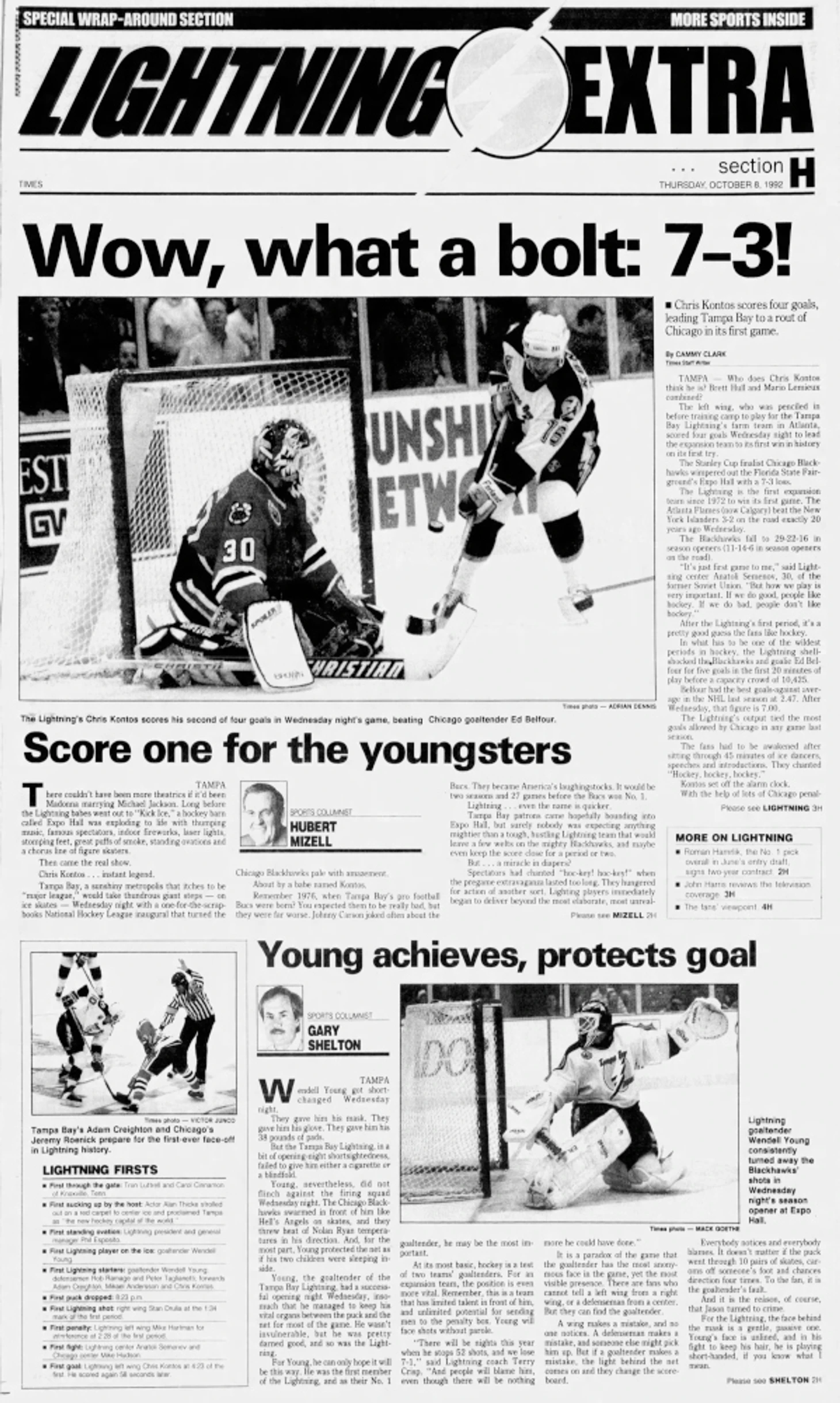 Поскольку партнеры Рассела покатились на смену, он не стал идти в одиночку на ворота, а, едва переехав собственную синюю линию, запустил шайбу «парашютом» в сторону зоны Молнии и тоже отправился меняться. А вот дальше произошло необъяснимое. При виде приближающейся шайбы Уэнделл Янг нелепо подпрыгнул и собственным щитком срезал шайбу в собственные же ворота. К слову, эта шайба стала дважды «первой». Помимо того, что это был первый гол, пропущенный Молнией в своей истории, он стал также и первым голом в карьере Рассела в НХЛ.