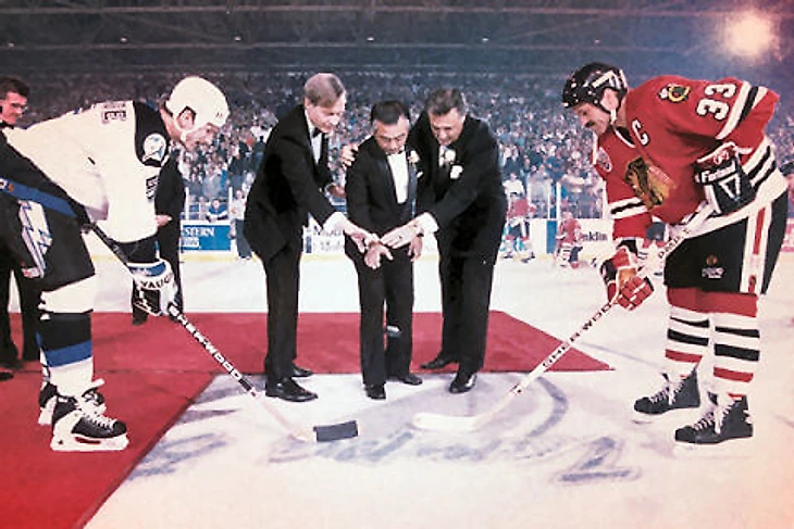 Первый конфуз. Формальный глава клуба, президент Lightning Partners Inc. Йошио Накамура, который должен был выполнять непосредственно вбрасывание, оказывается, не имеет понятия, что он должен делать. За всеми подготовительными хлопотами все забыли, что японские хозяева клуба о хоккее имеют представление весьма приблизительное, а заранее объяснить им смысл и порядок действий в привычных всем хоккейных церемониях никто не удосужился. Произошла заминка, во время которой управляющий команды Дэвид Лефевр и Эспозито с двух сторон объясняли Накамуре (который к тому же слабо понимал английский язык), что же от него требуется.