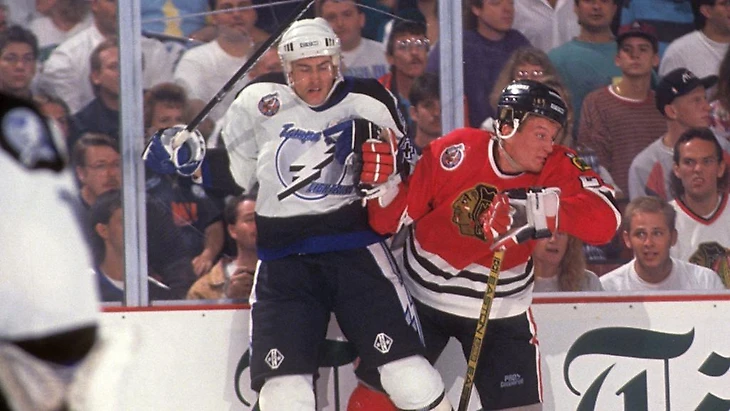Первый бросок по воротам Молнии. Его на 20-й секунде встречи наносит легендарный уже тогда защитник Чикаго Крис Челиос. Особой опасности бросок не таил – Челиос щелкнул в сторону ворот, даже не пересекая синюю линию. По-канадски – это классический вброс шайбы в зону. Янгу не составило большого труда отразить бросок в левый от него угол площадки.