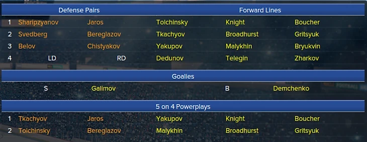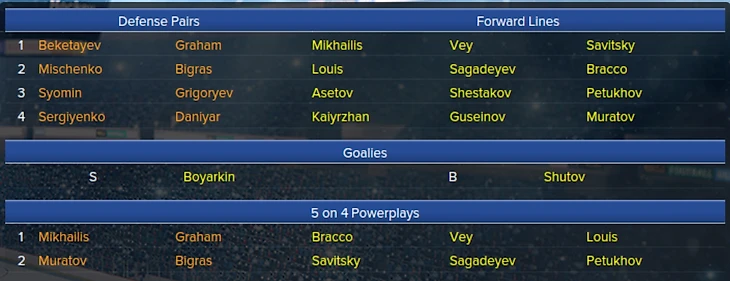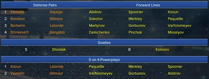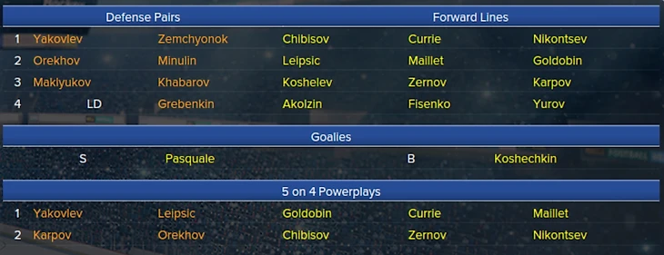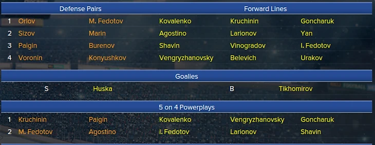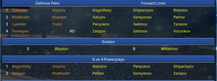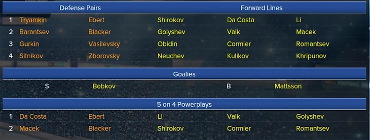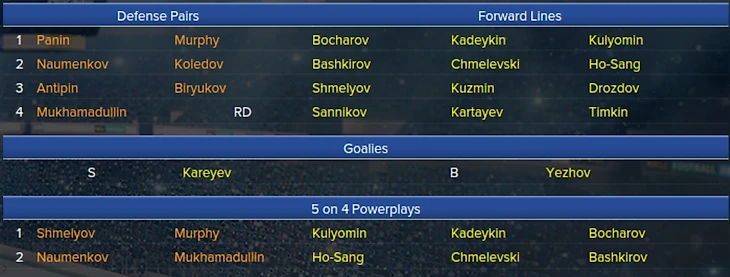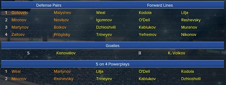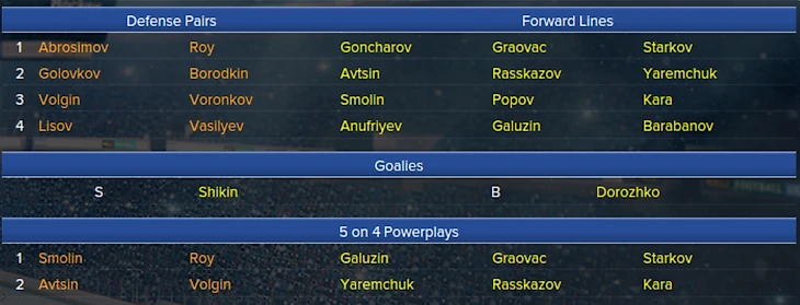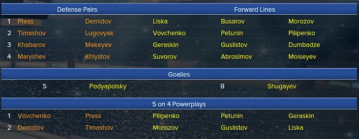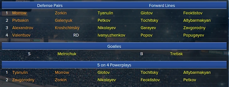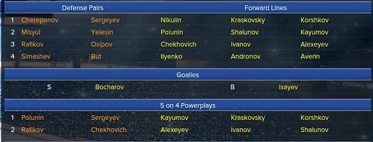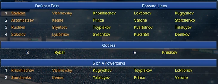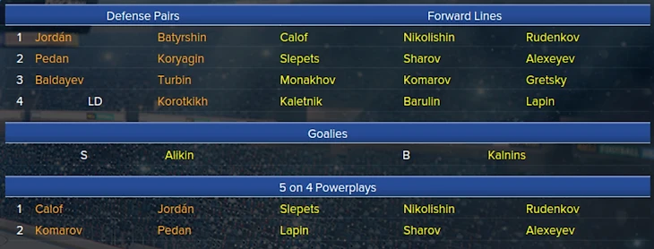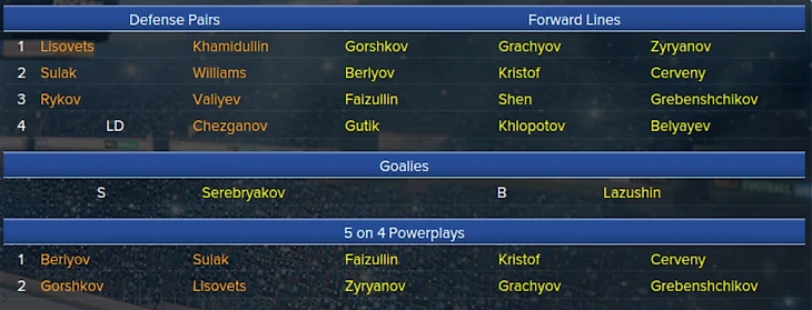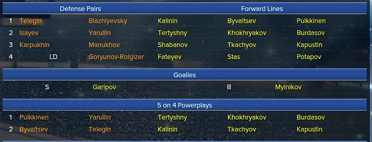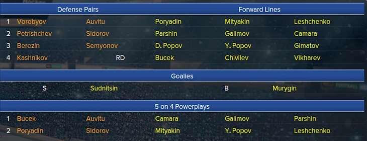 Серебряков (1400) без сомнений одна из главных звёзд этой команды и неоспоримый основной голкипер. Опытный Лазушин (1300) и вечный вхловец Хомченко (1200) будут подменять его разок в 5 игр в лучшем случае.
