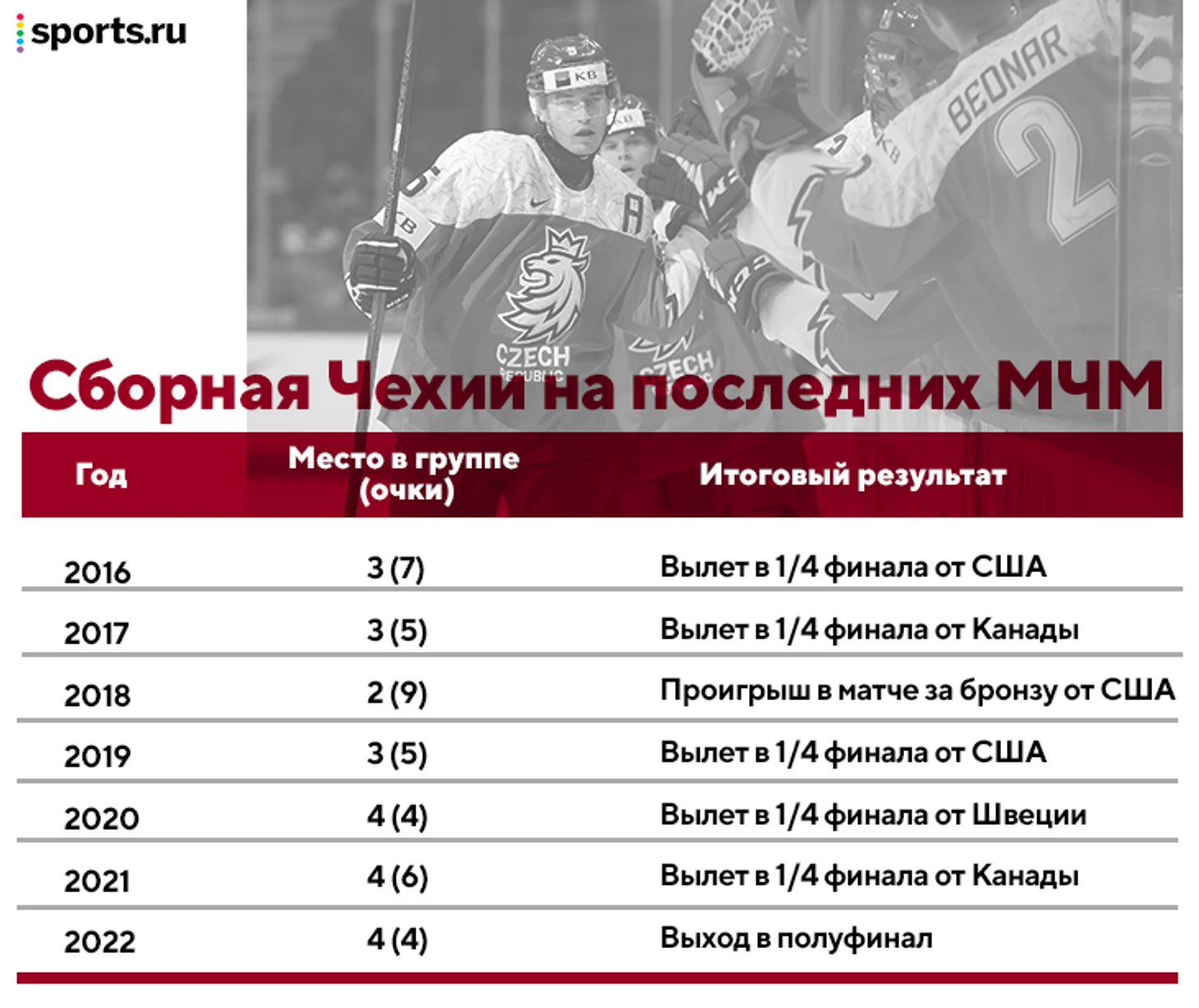 Этот успех чехов – безусловно, главная сенсация всего турнира, и вряд ли будет круче. На групповом этапе МЧМ-2022 они выступали посредственно. После волевой победы над Словакией в первом туре (5:4) команда взяла только одно очко (поражение по буллитам от финнов – 3:4Б), а затем бесславно отлетела от канадцев (1:5) и тех самых латышей (2:5) – и опустилась на четвертую строчку. Это гарантировало им попадание в 1/4 на лучшую сборную группы B – американскую.
