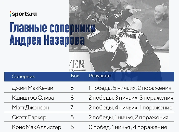 Дрался он немногим реже, чем выходил на лед. За «Бостон» в сезоне-2000/01 Назаров сыграл 63 матча и провел 20 боев – то есть в среднем в каждом третьем матче.