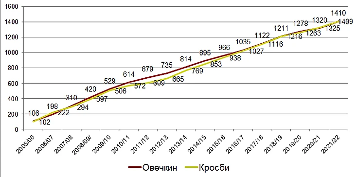 Если смотреть на их противостояние с позиции гонки по общему количеству очков, то смотрится это так: обмен успехами в 2 первых сезона, а после 3 сезона Овечкин все время опережал Кросби, а пик преимущества составлял 70 очков по итогам сезона 2011/12. Однако с сезона 2013/14 Сид начал догонять и опередил к окончанию сезона 2018/19. В последние 3 года маятник травм качается в разные стороны, в результате чего на старт сезона 2022/23 вечные соперники выходит с равными позициями (всего +1 очко в пользу Ови).