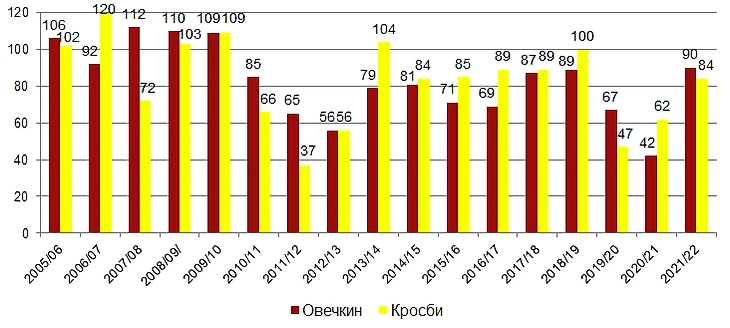 Сезон 2021/22 в первой своей половине характеризовался огненной формой Овечкина, тогда как Кросби пропускал начало. Во второй часть сезона канадец был более результативен, чем россиянин, который прилично сдал и откатился от серьезного претендента на Харт на уровне с Макдевидом-Мэттьюсом до всего 16-го по очкам в лиги, а по шайбам хоть и был достигнут рубеж в 50 шайб, но это только 4-й результат после Мэттьюса, Драйзайтля и Крайдера. Тем не менее, сильнейший старт предопределил итоговое преимущество по очкам 90 против 84, хотя Сид был хорош во второй половине регулярки.